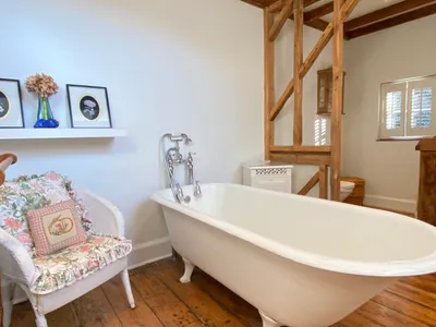 The bathroom is more of an occasion with a free-standing, clawfoot bath being the focal point of the room for a peaceful, relaxing bath and if some company is desired there is comfy chaise longue.