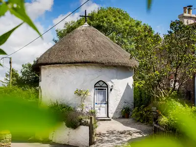 Romantic, historic thatched Round House in friendly Cornwall village for two, dogs welcome. Grade II* listed property near the coastal path, dog-friendly beaches, coves, pubs and restaurants, gardens and galleries.
