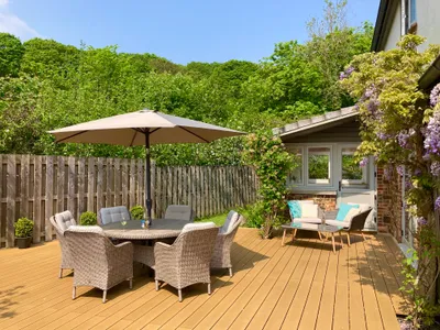 Enjoy the sunshine on the large, private, south-facing decked terrace, complete with outdoor chairs, sun loungers, a parasol, and comfortable dining furniture. There’s also a gas BBQ—perfect for al fresco meals after a day of adventure. The fully enclosed and gated garden features a lawn and flower beds, with ample space for safely storing bikes, surfboards, and other outdoor gear.