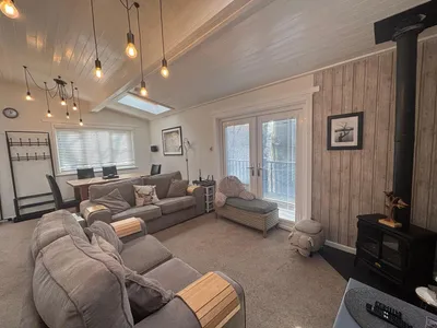 The open-plan living space features comfy sofas, a 55-inch TV, and a cozy electric log burner. The dining area seats six, perfect for family meals. The fully-equipped kitchen includes everything you need for self-catering.