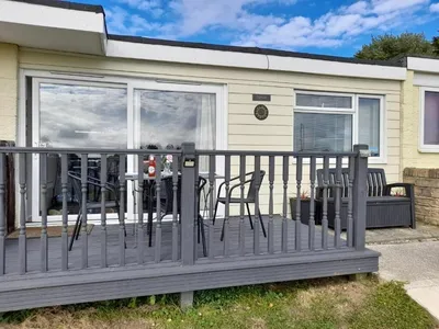 Sunset is located in a quiet self catering holiday park on the outskirts of Sandown. It is a purpose built chalet and with an elevated yet sheltered, sunny position.With far reaching views to be enjoyed from inside and a decking area which has its own seating and dining area. This is now enclosed and gated, so ideal for keeping pets and small children in! As the name suggests the sunsets can be spectacular. There is also an enclosed grass area in front of the chalet where children can play safely. The chalet has WIFI included in the cost, with good signal strength. Electricity is also included.