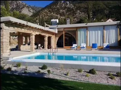 The Stone House is a beautifully renovated villa with a private pool and garden. Along the length of the villa are stone arches and floor to ceiling sliding doors opening up to the large pool terrace. The large living area comprises of a sitting area, dining area and open plan kitchen. It has high ceilings with wooden beams. the bedrooms are spacious and again have high ceilings. Both bedrooms have air conditioning units and plenty of storage space. There is a shared bathroom between the bedrooms with modern shower, wc and basin. The kitchen is fully equipped. There is a television with dvd player along with free wifi.The pool terrace has spectacular views down the mountain to the sea. There is a covered seating area along with a shower by the pool and an additional bathroom / wc. Wooden sunbeds with cushions can easily be moved around the terrace to allow for sun or shade.