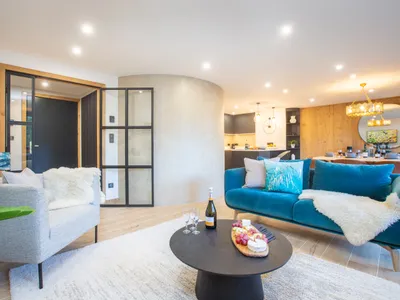 A prime location, only two minutes flat walk to the centre of Morzine and Pleney telecabine. The apartment is very family friendly and great for kids due to its location and proximity to ski school meeting points. Located on the second floor of the building, with a lift.Apartment Demi Lune has a spacious and light kitchen living area, the windows and balcony offer views of the Pleney and surrounding greenery. Offering plenty of space for 6 people, there is a large dining table, modern kitchen, comfortable sofa area with LED electric fireplace and curved feature wall. There is a large flatscreen TV with Netflix, Games Console and Free WiFi.