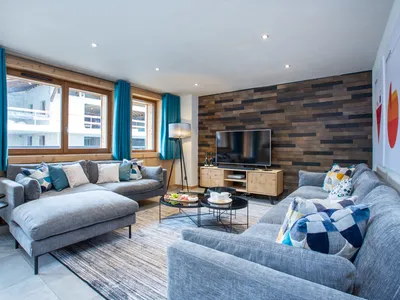 Directly opposite the Pleney Telecabine, Ski Schools and Tremplin in the centre of town. Oversized large apartment with 3 bedrooms and 3 ensuite bathrooms, sleeping up to 7 people in a piste side location. You enter the apartment into a large open plan living area which features a spacious lounge with balconies overlooking Morzine, comfy corner sofas, large dining table and a modern kitchen diner with breakfast bar and all mod cons including wine and beer fridge as well as washing machine and tumble dryer.
