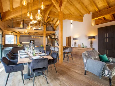 The main living space is on the top floor of the chalet which is at entrance level. There is a practical ski boot room and large entrance area which leeds you to the vast spacious living area. Double Height with exposed beams and large windows which show off the mountain views with slidinig doors leaving onto large wrap around balconies. You can't get much better for your morning coffee or evening Apero!