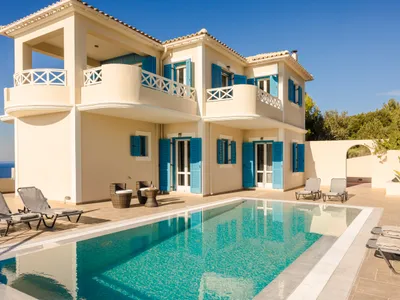 The villa layout has the ground floor main entrance leading into 3 bedrooms two bath (one en suite) with laundry room (washer & dryer). The bedroom french doors a lead out to the patio and pool area. A spiral staircase leading up to the top floor, to a large open plan layout, with a fully equipped kitchen and living area, large windows complement breathtaking views across the penisula and the Ionian pelagos. There is also guest WC. the pool can also be accessed from the staircase behind the house , down to outdoor BBQ and pool area.