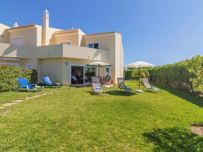 The villa sits at the end of the terrace of the condominium with its own large private garden, which is grassed (not shared with the other villas) surrounded by hedging. It is enclosed so safe for toddlers. There is a road nearby but road noise is not significant. There is a large private pool shared with the other villas, but as the other villas are mainly owned by local Portuguese, who are are work during the day, it means the pool is usually very quiet. Sunbeds of course are provided in the garden area and beside the pool.