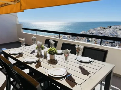 This amazingly spacious duplex apartment is located on a hillside overlooking the Old Town of Albufeira and Fisherman's Beach. The living area and bedrooms are located over two floors, each boasting fantastic views towards Fishermans beach and the old town of Albufeira. The 2 large balconies, which many guests have commented they have spent most of their holiday wining and dining upon, entertain you with the constantly changing marine and beach activity. The lounge area, like the outdoor terrace, is south west facing with floor to ceiling patio windows offering the same panoramic views. The complex itself incorporates a large outdoor swimming pool and an area for family BBQing. Only 5 minutes walk away you find yourself in the quaint Old Town of Albufeira with its restaurants, bars and refurbished Fishermans square offering full entertainment for adults and children alike. Car hire is not necessary as two large supermarkets are within a 5 to 10 minutes walk and a smaller supermarket is within a 2 minutes stroll. There are many golf courses close by (3 courses within a 10 minute drive and a number of other courses within a 30 minute drive), they include Salgados, Vilamoura, Vale do Lobo, Pine Cliffs and Vila Sol plus many more. Mentioning just a few of the other fantastic attractions the Algarve has to offer, they include Aquashow Park of Quarteira, Slide and Splash in Lagoa, Zoo Marine in Guia, the annual Fiesa Sand Sculpture festival (the largest in the world, running from April - October) and many more. Visitors who have returned to this apartment year after year comment “with the location, views, spacious surroundings and overall feeling you get from staying in the apartment, how could anyone be disappointed?”Further details indoors:-