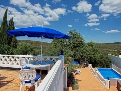 This charming two bedroom, two bathroom cottage is accessed via a quiet country lane and has stunning views across the Algarve hills towards the coast. Stylishly and yet traditionally furnished and retaining many of its original features, the cottage offers the perfect retreat. The private fenced and gated pool is a good size and you can find shade under the old olive tree. For the sun worshippers, there are sun loungers on the large private terrace.The covered veranda leads into the cosy sitting room with terracotta tiled floors and comfortable furniture. The well equipped kitchen has the original stone work surface and oak table with seating for 6. The original 18th Century manger stalls have been cleverly restored to form additional seating. There is a pretty terrace off the terrace which is perfect for lazy breakfasts. The two bedrooms are nicely furnished with the crisp white bedding contrasting with the Portuguese wooden furniture. The master bedroom leads onto the terrace where you feel that you have the whole of this glorious area to yourself. To the front of the house is a "hidden" Mediterranean garden among the olive groves - the only sound is that of birdsong.