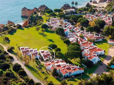 Permanent security service and children's play ground. This comfortable property, with units of hot and cold air in every room, just 200m away from the beach and both swimming pools, off street parking, terraces with complete privacy. Cosy south facing terrace with sea view, roof terrace. Everywhere around the house. There are beautiful gardens and quite lovely corners. There is a gate to the open patio and a door to entrance hall, a lovely covered terrace with French windows to the spacious dining/living area, small but well equipped separate kitchen; the master bedroom with en suite shower room, a dining/living room with fire place (just for décor) and door to terrace.A tastefully decorated COTTAGE in a high standard tourist complex along the most picturesque part of the coast: ALVOR BEACH, PRAINHA E TRES IRMÃOS, where guests have at their disposal all facilities, fun and leisure. Set on a cliff top, with a breathtaking view over Lagos Bay, Alvor estuary and Monchique mountains, in an area natural beauty but only 5 km away from Portimão. There is a seawater swimming pool (free access for resident guests) with Snack-bar (speciality: prawns) carved on the cliff top and set among a unique scenery. The access to the beach is made through a lift built within the rocks, which also leads to a bar-Restaurant right on the beach.Besides having 3 tennis courts, one squash court, is close to several of the best golf courses in the Algarve, the closest on is PENINA GOLF COURSE. And water sport at Alvor beach.