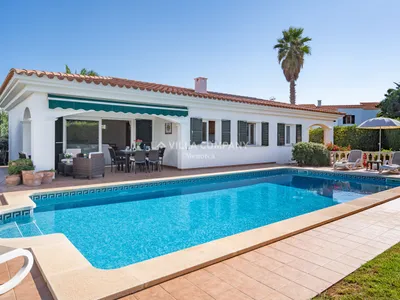 Situated in the residential area Punta Grossa, Villa Sa Pau provides a quiet escape while being conveniently close to Menorca´s popular north coast resort Arenal d’en Castell. The beautiful white sand and turquoise water beach is less than a 10 minute walk away, as are the variety of bars, restaurants and shops. Both Mahón, the capital of the island with its beautiful natural harbour, and Ciutadella, the historic capital of the island, are a 25 minute drive in opposite directions.The outdoor area offers a perfect blend of sun and shade. A 10m x 4m swimming pool takes center stage, surrounded by a tiled terrace with sunbeds. Beyond the pool, a grass lawn offers a refreshing green backdrop. The covered porch provides shade, furnished with a dining table and chairs for outdoor meals, as well as comfortable garden sofas for relaxed lounging. There is also has a stone barbeque for al fresco cooking.