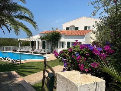Villa Rosa is a large, pretty four bedroom detached villa situated in a quiet cul-de-sac in Binibeca, the villa backs on to green belt countryside. The villa is on a good sized plot with well maintained gardens, extensive terraces (both covered and open) and a large swimming pool.Three of the bedrooms are downstairs, two are twin bedrooms both with fitted wardrobes, they share a family bathroom with a shower over the bath. There is also a double bedroom, again with fitted wardrobes and views over the far reaching countryside. This room has an ensuite bathroom, with a shower over the bath. The master bedroom is upstairs, it has an ensuite with shower over the bath and patio doors which lead on to a large wrap-around terrace offering wonderful views of both the sea and the countryside.