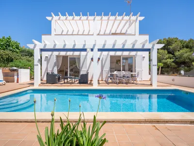 A fully equipped modern detached villa in Binibeca in its own grounds, with a private pool and air conditioning in all bedrooms. In a quiet location and with sea view. The beautiful Binibeca beach enjoys Blue Flag status and is 650 metres away and 9 minutes walk. A 5 minute stroll will take you to several local bars and restaurants, and there are a couple of small well stocked supermarkets - which have fresh bread daily. A children's' playground is nearby, plus the bus stop giving regular service, and the local 'road train' which can easily take you to other beaches and resorts.The Villa can sleep up to 6 and is superb throughout and fully furnished. It has 3 double bedrooms, two bathrooms, a large lounge/diner - which leads out to the patio - which is next to the pool so a great way for family and friends to chill out. Maybe cook on the BBQ or just laze around the pool with a cool drink and check out what the fantastic Island of Menorca can offer you.