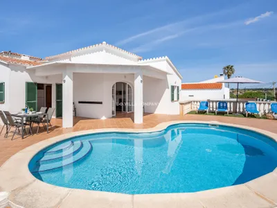 Villa Vergara is situated in a cliff-top tourist resort, Cala’n Porter, on the south coast of the island and only a 10-minute drive from the airport. The town has everything within walking distance, with a variety of bars, restaurants, supermarkets and souvenir shops. The wonderful beach with crystal clear waters can be accessed via road or steps and offers two beach bars serving local tapas and beverages. Other south coast beaches (Binibeca, Punta Prima, Binisafúa, Son Bou) can be reached within 15 minutes by car, and the capital town Mahon is also only a 10-minute drive away. Car hire is available from the resort and a daily bus service runs between Cala'n Porter and Mahon.The garden area has a spacious terrace surrounding the kidney-shaped swimming pool. There is an area with an artificial lawn furnished with loungers for relaxing in the sun, and a covered porch furnished with table and chairs for al fresco dining. The villa also has a stone barbecue.