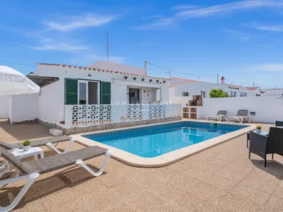 Villa Plomero is located in Cala en Porter, a wonderful beach resort just 7km from the capital town Mahón and the airport. This south-coast village offers a variety of bars, restaurants and supermarkets, all within a 10-minute walk from the villa. The spectacular white sand beach with shallow turquoise water and beach amenities, including sunbed and umbrella hire, public showers, public toilets, beach bars, kayaking, a children´s playground, and free parking, can be accessed via steps or road. For those who would like to explore the island, there is car hire available from the resort centre and public buses to Mahon and Alaior.A 340m2 plot close to the countryside, the villa has a gated entrance with an enclosed garden. Surrounding the private swimming pool (7m x 3m) is a sunbathing terrace furnished with loungers, a parasol, and garden sofas for relaxing in the sunshine. The shaded porch has direct access to the lounge, is equipped with an outdoor table and chairs for al fresco dining, and a stone barbeque.