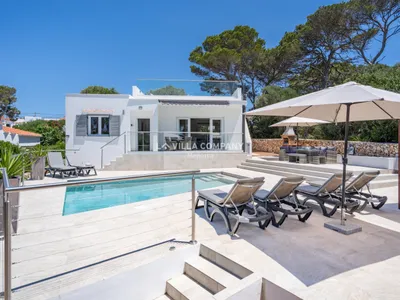 Villa Florida is nestled in the cliff-top tourist resort of Cala’n Porter on the island’s south coast and just a 10-minute drive from the airport. Ideal for families, the town offers a variety of bars, restaurants, supermarkets, and souvenir shops, all within easy walking distance. The stunning beach with its crystal-clear waters can be accessed by road or steps and features two beach bars serving local tapas and drinks. Other beautiful south coast beaches, such as Binibeca, Punta Prima, Binisafúa, and Son Bou, are approximately a 15-minute drive away, and the capital, Mahon, is only 10 minutes by car. Car rentals are available in the resort, and a daily summer bus service runs between Cala’n Porter and Mahon.The exterior of this beautifully refurbished villa exudes modern elegance, with clean lines and stylish touches, creating the ideal outdoor living space. Bordering the swimming pool is a sunbathing terrace furnished with loungers that provide the perfect spot for soaking up the sun. A charming pergola shelters an inviting outdoor lounge area with comfortable sofas, creating a cool, shaded space for unwinding with family and friends. For those who love to cook, a stone barbecue stands ready, while a large dining table with chairs nearby offers a picturesque setting for alfresco meals.
