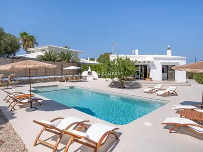 Casa Timée is situated in the tranquil residential area of Cales Coves, just a 5-minute drive from the charming village of Sant Climent and the stunning white sand beach at Calan Porter, where you can explore a range of bars, restaurants, and souvenir shops. Other white sand beaches on the south coast, such as Binidalí, Binibeca, and Binisafúa, as well as the capital town of Mahón, are all accessible within a 10-minute drive.Set on an expansive 860m² plot, the villa boasts a stunning outdoor space designed for relaxation and enjoyment. The spacious garden has an impressive 12m x 5m swimming pool with an incorporated shallow platform for small children. Surrounding the pool is a tiled terrace with comfortable loungers for sunbathing, and an exterior dining area, complete with a large table, chairs, and a stone barbecue, providing the ideal setting for alfresco meals. With direct access to the lounge, a covered porch with an inviting outdoor sofa offers a cosy spot to unwind and relax in the shade.