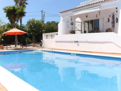 Traditional Portuguese villa all on one floor boasting 3 comfortable double bedrooms , 2 bathrooms, 1 ensuite, private large pool, off road parking with a car port, air con in all bedrooms and lounge. Roof terrace with seating area taking in those sea views and sun sets. A well equipped family kitchen for self catering needs. Outside there is a family eating area with a built in stone barbeque , roof sun terrace with a pergola perfect for those sundowners, sunbeds by the pool and plenty of shaded seating areas. The villa is fully fenced and private with a small landscaped garden . The pool is spacious and steps lead into a shallow end 1.1metre depth and the deep end 1.9 metres depth ideal for children or those with restricted mobility together with comfy sunbeds and sufficient shade for hot days.