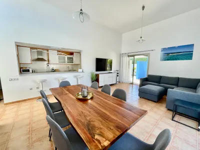 Villa Melissa is a luxury villa with modern and stylish decor in a peaceful location on the Salinas Golf Course. The popular resort of Caleta de Fuste is just a 5 minute drive away with numerous bars, restaurants and beaches. (Please note: food and drink items shown on the photographs are for illustrative purposes only and are not included for your stay) Inside, the villa has fresh, modern furnishings, offering bright and airy interiors and allows plenty of light throughout. The open breakfast bar was created so that a family can enjoy an open plan living experience. The living room has an L shape sofa and smart television to sit back and relax during the evenings, with UK TV channels and various other languages. Free Wifi throughout the villa. There are three large bedrooms - two kingsize and one with two single beds, plus a 4th bedroom with a split bed that can sleep two children. All bedrooms have patio doors to the outside areas but also have shutters which keeps the bedrooms cool and allows the evening/night breeze flow but with security. From the lounge there are patio doors to the shaded outside soft seating area and a large dining table that seats 8, a Canarian BBQ and a jacuzzi for 3 persons, for those relaxing evenings after your days of exploring and sunbathing. The second set of patio doors from the living room takes you right out to the pool area and 8 sun-loungers, where you can soak up the sun all day long or swim in the spectacular salt water pool, which has a retractable dome-style cover, perfect for evening swimming and for the children. The pool size is 10 x 4 x 1.40m. There is also a small paddling pool for youngsters which is 2m and has a shallow depth of 30cm. (Please note there is an additional charge for pool heating.) As there are no stairs the villa is suitable for eldery and disabled access and due to its quiet location the villa gives 360° privacy, ideal for golfers and families alike. This beautiful villa is a fantastic home away from home and is a great base to enjoy your Canarian holiday. A car would be recommended as there are many beaches, villages, and sand dunes to explore on this fabulous island all within easy reach. There is either private or street parking. Golfers love the area and the immaculate eighteen-hole golf course once hosted the Spanish Open tournament.Bedroom Details