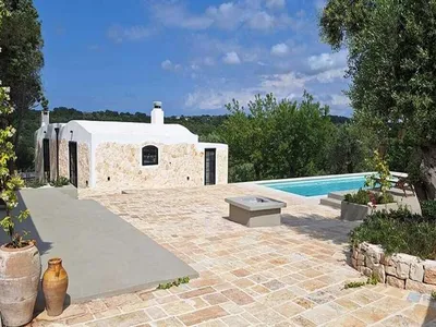 Pineta Farmhouse is located in the community of the Valle d’Itria and is one of the most coveted for its beauty and its scenic location, and the delightful farmhouse provides visitors with an idyllic place to enjoy this area in luxury and style.This five-bedroom gem sits in its own private gardens, surrounded by mature trees and plantings, and offers a stunning range of indoor and outdoor living spaces that can easily create your ideal holiday getaway.The focal point for most visitors is the courtyard private pool and its surrounding terrace which wraps around the 10 x 4 salt-based pool, it faces the south east and provides an unbelievable daily view of the valley below.