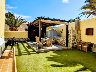 Casa Sol is a simply stunning Villa that benefits from Air con to bedrooms and lounge, Heated pool, Hot tub and Fibre Wifi which is great if you need to work whist on holiday. Modern online UK, Irish and international TV System to enjoy on a 55"LED TV, includes BBC, ITV etc if you want to catch your favourite tv shows whilst on holiday. Casa Sol is a South Facing 3 bedroom Villa situated on a quiet complex with views of mountains and distant views of the famous Corralejo sand dunes. It has 2 private parking spaces in front of the Villa. Ideally located only 5 minutes walk from the Lidl and Mercadona supermarkets, a handful of bars and restaurants and is adjacent to the Bahiazul Complex. The centre of Corralejo is only approx €8 (depends on tariff) taxi ride away or a nice walk with plenty of places to stop for a liquid refreshment on the way!There are lots of fabulous beaches in and around Corralejo, the famous sand dunes are not to be missed and only a 5 minute drive away. Casa Sol is the perfect home from home with everything you could possibly need to enjoy Fuerteventura's 300 plus days of sunshine every year. The Villa has plenty of outside space and numerous terraces. As you walk through the gate into a front garden with a tiled and Artificial grassed area with Sofa, chairs, sunbeds and a shaded seating area with a coffee table. The side terrace has a raised tiled area under a pergola with a stunning outside kitchen with built in BBQ and dining area.