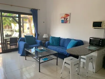 The apartment is in a beautiful and peaceful complex with sixteen privately owned apartments. A twenty minute walk to the center of Corralejo and fifteen minutes walk to the start if the famous sand dunes. It is also five minutes walk away from the nearest beach. The apartment has a private entrance with street side parking outside the complex. A large communal pool is surrounded by sunbathing terraces.The living room has a large comfy sofa and an armchair. The kitchen is well equipped with a hob, microwave, fridge freezer, table top cooker, washing machine, iron and all essential self catering items. A security safe is also included in the apartment. The bathroom is newly refurbished and tiled with a built in shower, WC and a wash hand basin. The living room has a sliding door onto a private patio area which has a table, 4 chairs, 2 sun loungers and a sun umbrella. The pool is heated during the winter months, there is a perspex barrier around the pool for safety, however the apartment is not suitable for children under 3. Local amenities such as supermarkets, bars and restaurants are nearby including the Campanario Shopping Center.