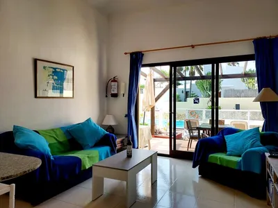 The apartment is in a beautiful and peaceful complex with sixteen privately owned bungalows. A twenty minute walk to the centre of Correlejo and fifteen minutes walk to the start of the famous sand dunes. It is also five minutes walk from the nearest beach. The apartment has a private entrance with street side parking outside the complex. A large communal pool is surrounded by sunbathing terraces.The living room has a large comfy sofa and an armchair. The kitchen is well equipped with a hob, microwave, fridge freezer, table top cooker, washing machine, iron and all essential self catering items. A security safe is also included in the apartment. There is a separate dining area with a table and four chairs. The bathroom is newly refurbished and tiled with a built in shower, WC and wash hand basin. The living room has a sliding door onto a private patio area which has a table, 4 chairs, 2 sun loungers and a sun umbrella. The large shared pool is very well maintained and has a a safety barrier for children. However the apartment is not suitable for children under 3. Local amenities such as supermarkets, bars and restaurants are nearby including the Campanario Shopping Centre