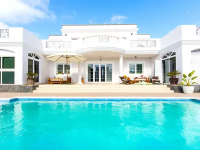 The pool heating costs € 25 per day extra payable upon arrival.Beautiful 2 storey, 6 bedroom Vacation Rental Home located in a quiet residential area next to the 18 hole golf course in Costa Teguise. The city center and the beaches are only 5 minutes away by car. There are 3 double bedrooms and 5 single beds.