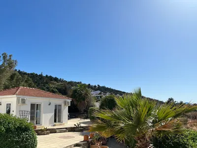 Carob Lodge is an elegant, comfortable, well-equipped complex. It consists of a bungalow, an annex (Ottoman area), a large pool, numerous terraces and balconies, and a secluded orchard. It is situated near the owners’ villa. The area is paved and landscaped and enclosed by attractive walls and railings. Behind the garden, there are pine trees up the hillside. In front, you can see carob and olive groves under which sheep, goats, and sometimes a local donkey may graze. They mingle with new building developments which will bring variety and more facilities to the area.
