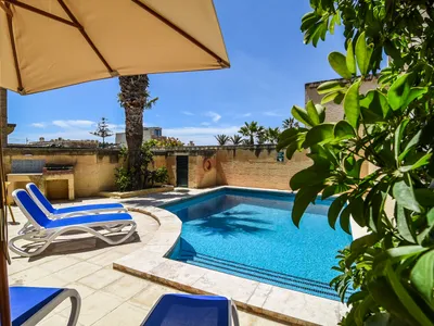 The secluded pool is fringed by a terrace that includes sun loungers, an outside dining table with Chairs, umbrella and BBQ.