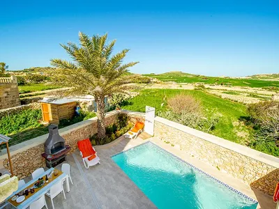 The ground floor pool and terrace offer a spacious and idyllic opportunity to unwind. There is a benefit of additional self-catering facilities such as a sink, storage space and a fridge, as well as the BBQ. A thoughtful touch given your location from the main kitchen. Here’s a great benefit. You have the best of both worlds. The opportunity to laze by the pool and enjoy a lunch time BBQ. Later, follow the external stairs to the elevated terrace. Relax and enjoy panoramic views whilst using the well-equipped kitchen to serve al fresco delights. The fine countryside ambiance here, has to top your Gozo holiday experience.