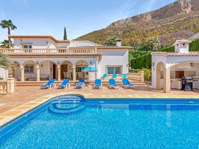 There is ample parking for 3 cars. The large garden is mostly patio areas and there are plenty of sun-beds for relaxing around the 10 x 5m swimming pool with roman steps, which can be heated (250 euros per week), and taking in the magnificent views, over the valley to the Montgo mountain or along the valley towards the Arenal. The large, covered terrace affords plenty of shade and comfort for relaxing or enjoying al fresco meals prepared on the barbecue.There is an outside pool shower, and a table tennis table.