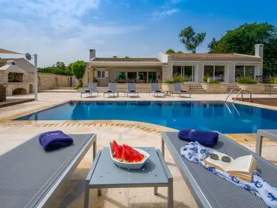 The house is situated on a flat piece of land and ideal for small children. We ourselves bought it when our children were very small and specifically designed it with a multi-generational group in mind. The pool is easy to monitor from both the living space and bedrooms providing extra peace of mind. There is a tree house, large sand pit, and an oversize, outdoor chess set. The Villa is situated on a quiet lane that leads down to a lovely beach which has fantastic sunsets. Kassiopi is walking distance away (0.8 miles) and there is a beautiful footpath along the coast and via olive groves that leads directly to the centre of Kassiopi. Going the opposite direction the superb restaurants of Avlaki Bay are only a 10 minute walk (0.4 miles) away. Beyond that is teh nature reserve and San Stefanos.