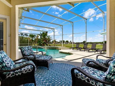 Outside the pool deck is very large at around 60 feet wide it is exceptional and rare in most vacation homes. Enjoy 180 degree views to the South and West over the course –the covered lanai, with fans to keep you cool, is a great place to relax, there is plenty of comfortable seating and loungers for sunbathing - the amazing sunsets are not to be missed!