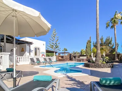 Villa “Autre Chose” is the ultimate in luxury vacations, an elegant and classy villa, located in the quiet residential area of Los Mojones, yet within easy access of the golden beach and resort of Puerto del Carmen.The villa has been decorated to an extremely high standard, the contemporary decor and simple but stylish furnishings give the house a bright and airy feel throughout. This secluded luxury villa can sleep up to eight guests, sits on a prestigious plot with fantastic outside space, 8m x 4m private heated swimming pool, hot tub and children's pool which are enclosed by the volcanic walled gardens with fountain. The villa is further enhanced with 2 separate areas, Crazy golf, bar with American billiards, table tennis, darts and the New Orleans-style covered terrace for relaxing on a hot day.