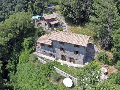 The original Farmhouse and Metato (chestnut drying store or barn) was built in 1840 and abandoned in 1946. The property was a total ruin and the restoration, completed in 2009, used traditional materials such as chestnut beams yet incorporating modern standards and and facilities. In the Parco Naturale delle Alpi Apuane on the south facing slopes overlooking the Turrite Valley across to the Alpi beyond in about 5 acres with a 10m pool. There is a gated access from the public road down to a parking area sufficient for up to 6 cars, (plenty of room for ball games}. From the parking area, proceeding towards the main house you will first pass the pool on your right followed by the entrance to the top Metato (king size bedroom with en-suite) followed by the entrance to the lower Metato (twin bedroom with en-suite). The farmhouse is entered on the middle level into the fully equipped kitchen. The separate dining room is on the left and on the right the sitting room, which extends out on to a terrace. The upper level has the main kingsize double bedroom, a single bedroom and a bathroom. The lower floor has two twin bedrooms, a bathroom and utility a room. The adjacent Metato has a kingsize double bedroom and twin bedroom, both with en-suite and separate entrances. All the rooms are furnished in a similar way to the photos. The pool area can be enclosed and has a gate. The lower terrace outside the ground floor is also fenced although the grounds extend further. There is an outside dining area with BBQ and there are several separate area in which to relax and plenty of recreational space for children to play. Free unlimited wifi and mobile phone reception is excellent.Bedroom Details