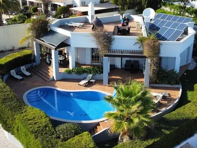 Fantastic opportunity to rent this modern three bedroom villa in Calicas, one of the most sought after areas of Lagos behind the 4km long Meia Praia Beach. The villa is set in its own 1/4 acre plot on a quiet residential road nestled on a hill in a picturesque established area on the edge of Palmares Golf Course. There are doors to the garden from the living room, kitchen and bedroom with plenty of covered and uncovered terrace areas for relaxing and sunbathing as well as beautifully landscaped gardens. There is a wonderful furnished roof terrace offering panoramic views to the mountains and the sea. The villa has been furnished with great care and to a high standard. The villa's electricity is now run by solar which is not only eco friendly but also means we are not impacted by any local power outages - any issues with the solar it does of course revert back to the grid.The house has a TV package including Sports, BBC and ITV, an extensive DVD library, fully equipped kitchen, dining table for 8, selection of reading books. The Master bedroom has a king size bed and en suite bathroom with bath/shower whilst the other 2 bedrooms share a 2nd bathroom with shower - the second bedroom has a large double bed and a sofa bed suitable for a child; the 3rd bedroom has a small double and 1 single bed. Outside you have a beautiful enclosed garden with heated pool, elegant outside dining furniture plus outside seating area on terrace and 6 sun loungers around pool. Up on the roof terrace you have a further dining table and chairs, 2 more sunbeds and a Moroccan day bed which is perfect to escape to! 5 minute drive to beach, marina, old town of Lagos and Palmares golf course, so perfectly situated and if you want to have a few drinks it only costs around 6 euros in a taxi. Truly everything you could wish for! Please rest assured that we are genuine owners with a good history of renting out this property; feel free to contact me on my mobile if you need reassurance in addition to the excellent feedback we have from previous guests.