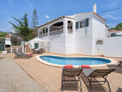 This lovely villa is situated in a cliff-top tourist resort, Cala’n Porter, on the south coast of the island. The town is ideal for families and offers a variety of bars, restaurants, supermarkets and souvenir shops. The wonderful bay with crystal clear waters is a 7 minute walk from the villa and can be accessed via steps or road. Other south coast beaches (Binibeca, Punta Prima, Binisafúa, Son Bou, etc) can be reached in less than 15 minutes by car, and the capital town Mahon is also only a 10 minute drive away.Villa Sylvia is located in a quiet area bordering the open countryside. The swimming pool is located on the lower level of the property and is surrounded by a spacious terrace furnished with sunbeds. Next to the pool is a table and chairs and stone barbecue for al fresco cooking and dining. On the first floor, with direct access to the lounge and exterior access to the swimming pool, is a covered porch furnished with outdoor sofas for relaxing in the shade and enjoying the peaceful country views.