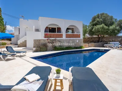 Villa Caterina is situated in a cliff-top tourist resort, Cala’n Porter, on the south coast of the island and only a 10 minute drive from the airport. The town is ideal for families, with a variety of bars, restaurants, supermarkets and souvenir shops, all within walking distance from the property. The wonderful beach with crystal clear waters can be accessed via road or steps and also offers two beach bars serving local tapas and sangria. Other south coast beaches (Binibeca, Punta Prima, Binisafúa, Son Bou) can be reached in less than 15 minutes by car, and the capital town Mahon is also only a 10 minute drive away. Car hire is available from the resort and a daily bus service runs between Calan Porter and Mahon during the summer months.Connected to the lounge is an “L” shaped veranda, furnished with table and chairs for al fresco dining and relaxing in the shade. The pool terrace, which is gated and accessed via steps or ramp, has sunbeds, a second table with picnic benches, and a stone barbecue. At the entrance façade of the property there is a garden with indigenous plants and a small terrace with a third table with chairs.