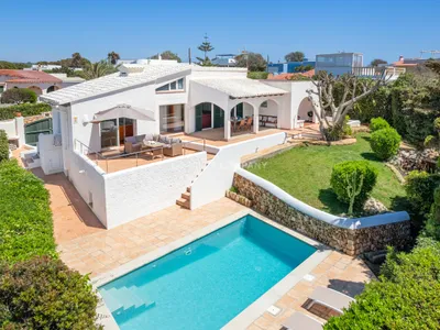 Villa Estrellas is situated between Binibeca and Punta Prima, in the charming village Son Ganxo. Traditionally a fisherman´s village, Son Ganxo is a tranquil area with residential and holiday villas. Just 250m from Villa Estrellas are picturesque rock platforms with direct access to the Mediterranean Sea, and a 10-minute walk away will bring you to the small cove that is ideal for swimming and snorkelling. Son Ganxo offers two restaurants serving Mediterranean and Italian cuisine, and the popular fine dining restaurants in and around San Luis are a 10-minute drive away. A vehicle is necessary when staying at this villa and free street parking is available directly outside the property.The exterior is spacious, with various areas to enjoy the sunshine or relax in the shade. Surrounding the swimming pool (7m x 3m) is a tiled terrace furnished with sun-beds and a garden with pretty indigenous plants. Connected to the lounge is a covered porch with partial sea views and a table and chairs for al fresco dining. On the same level is a second open-air terrace with garden sofas and a large parasol for relaxing in the shade.