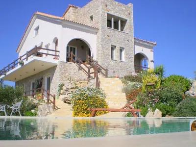 Bower House is no ordinary residence: its uniqueness, both inside and out, is what makes it so very special. Situated in the heart of boutique Greece in the south west Peloponnese, Messinia, it enjoys 360 degrees of panoramic views of breath taking magnitude including: the outstanding Taygetos mountain range, the gulf of Messinia and the hills leading to Pilos.Bower House is located on a four acre olive grove estate producing it's own olives and olive oil. Privacy, peace and beauty surround you yet you are only a 20 minute drive from Kalamata airport and a five minute drive away from the small, typical Greek, fishing village of Petalidi, where all amenities can be found, restaurants, bars, cafes, bank, atm, bakeries, supermarkets etc and with several fabulous unspoilt sandy beaches close by you have everything you need for that perfect family holiday at your finger tips.