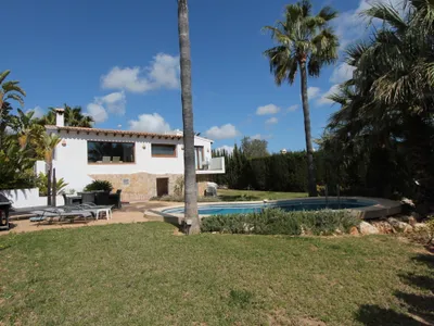 This modern family villa is in a great location, with a spacious garden for the children to play soccer, sea view from the dining room and kitchen. On the pool terrace there is a comfortable seating area, which is covered and some sun loungers overlooking the pool and palm trees. Its only a 2 minute drive or a good 15 minute walk to a supermarket, bar and restaurant. Moraira with its beautiful beach is a 7 minute drive or a 30 minute walk. The villa itself is all on one level with only 10 steps down to the pool and garden. Benefits from 3 bedrooms, 2 bathrooms, lounge, diner, fully fitted kitchen, private parking, air conditioning throughout, fiber optic WiFi and English free view TV channels.