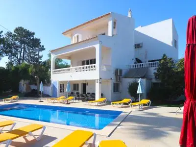 Villa Pinhal is a large private detached villa with plenty of parking, a large swimming pool and everything you need for a fantastic Portuguese family holiday. On the garden floor there is direct access to the ten by four metre swimming pool surrounded by a huge terrace with sunbeds and outside dining for twelve persons. Directly inside is a summer kitchen, with a dishwasher, microwave and a large fridge freezer, a snooker table, a football table, and further dining for up to twelve persons. Also on this floor is a cinema room, with a huge screen, a bedroom with twin beds a bathroom, plus a gym/exercise room, and a laundry room. Upstairs to the middle floor, there is a large fully fitted kitchen which has direct access to a terrace/balcony with outside dining for twelve, and a barbecue. Here is also an en-suite bedroom with a queen bed, a further shower room, and a huge lounge with seating for twelve,together with a 65" TV and a balcony. On the top floor there are two en-suite bedrooms, plus two more bedrooms and a further bathroom. There is air conditioning throughout the property including every bedroom. Although very close to the shops and the beach, the villa is mainly surrounded by farmland.Outside there is ample secure parking for several cars. Situated in a quiet area, mainly surrounded by farm land, the villa is just five minutes walk to Olhos D'Agua restaurants, and ten minutes to Olhos D'Agua beach. In addition it is just a short car ride to many of the well known water parks and attractions for which Albufeira and the Algarve are famous.