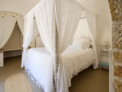 Trullo Ibisco has been designed with comfort at its core. It is spread across the main house and the original Trullo. The layout of the house is extremely congenial to holiday living due to the large gazebo area next to the big pool. You can find the perfect spot to enjoy a morning coffee, afternoon naps, long lunches or reading in the shade. We have carefully considered that we want to enjoy comfort, nature, fun and relaxation. Ibisco is a beautiful house, a labour of love that we have carefully designed in every detail. We love the house for its comfort, coziness and its rustic charm. From the handcrafted furniture, unique antique pieces, beautiful stone finishes to the garden day loungers and beds that we have imported from Kenya, we have created a home that feels warm, inviting, and full of character. Trullo Ibisco sleeps 8 with 3 Double bedrooms, all en-suite and an air conditioned Mongolian Glamping Yurt also with its own separate bathroom. There are two bedrooms in the main house and a further luxurious suite in the Trullo. All the bedrooms have been designed to give maximum space and comfort. Each bedroom is fully air-conditioned. The beds have White Company Egyptian Cotton sheets and towels. The outdoor kitchen is at the heart of the home - a perfect setting for entertaining, cooking, dining and relaxing. It is equipped with a wood burning oven, pizza oven, dishwasher and fridge and has everything you need for alfresco dining. Gather around the large dining table for long leisurely lunches or unwind on one of the many comfortable sun loungers. It is the perfect place to enjoy the beautiful weather, nature and the amazing produce the region provides.