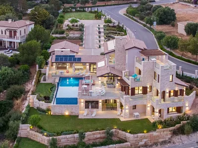 There are over sixty external doors and windows to let in the beautiful Cyprus sunshine by day and by night to admire the pools and gardens softly lit. The Villa's interior is beautifully decorated and fully furnished to a very high standard. A Lutron electronic control system is used to create several Mood Lighting Zones both internally and externally for the perfect atmosphere for any occasion. Central air conditioning and underfloor heating operates throughout. All 6 bedrooms which are en-suite, are fitted to the highest standards including satellite television, hairdryer and a room safe.