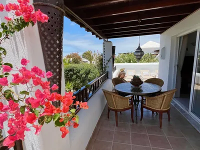 Casa Casablanca is in the tranquil, yet central Carlos Park area of Playa Blanca, 15 to 20 minutes walk to the town centre and 5 minutes walk to the seafront. From the terrace you have glimpses of the sea over the gardens and views of the stunning Montana Roja volcano. The villa is all on one level. The villa has a very relaxing feel and features Moroccan décor.The airy lounge has two sofas and TV with UK and international channels. Patio doors open onto the terrace. The kitchen has oven, hob, fridge freezer, microwave, kettle, toaster, coffee machine, and lots of crockery, cutlery and cookware. A utility room has washing machine, iron and ironing board. Bedroom 1 has twin beds pushed together, and patio doors to the terrace with views to the sea. There is a safety deposit box and ceiling fan. This bedroom has an en-suite bathroom with toilet, washbasin, bath with shower over, mirror, and hairdryer. Bedroom 2 has twin beds, a high ceiling, and a stand fan. Both bedrooms have wardrobes, drawers, mirror, shutters with mosquito nets and blackout curtains. Bathroom 2 has a walk in shower, toilet and twin washbasins. The villa’s L-shaped terrace has Moroccan wall lights and lanterns creating a lovely effect and atmosphere after dark. There is a ceramic topped table and chairs, four sunloungers with cushions, a dining area with large table and bench-style seating with cushions, and a cosy seating area. The two pergolas give the option to sit in the sun or shade for most of the day. Free parking is on the community's private road just to the side of the villa 30m away.