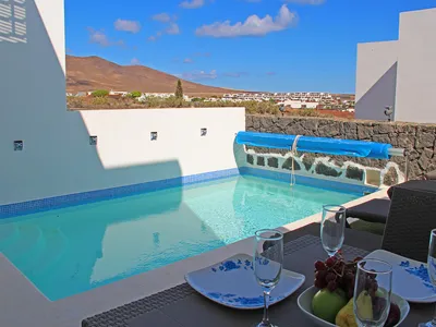 This 3 Bedroom Villa is located in the quite area of Los Colorados in Playa Blanca, 2 minute walk to the local supermarket and a 10 minute walk to the Pueblo Centre with several bars, restaurants and cafes. This duplex villa has 2 large double bedrooms, 1 good size twin bedroom. Ensuite shower room to the master bedroom and shower/wc between the double bedroom and twin. From the upstairs there is access to the large balcony where you can enjoy the sea views with seating area & Swing Chairs. The main downstairs area is open plan, with a well equipped kitchen, nice spacious dining area with seating for 6 people. The lounge has a new large comfortable sofa, English TV package provided and WIFI. There are 2 large patio doors leading onto the garden area, with a private pool and terrace, Pool heating available on request. From the kitchen there is a solana with Washing Machine and shower room, plus separate toilet. Pool Heating Available, charges £15 per day Price based on 4 people sharing, extra guests are charged at £15pn