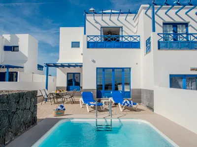 Elegant villa in a prime location, with a supermarket, cafés, and a bus stop just a 3-minute walk away, and the seafront promenade only 2 minutes away. Marina Rubicón, with its restaurants and shops, is a pleasant 10–15 minute walk.Set over two floors, the property offers sea views from the upper balcony, two double bedrooms (one en suite with balcony), a fully equipped kitchen, and a spacious south-facing terrace with a private heatable pool, sun loungers, and an outdoor dining area.