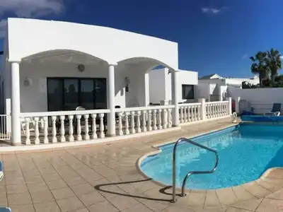 3 Bedrooms with Aircon 2 Bathroom Villa with Sea views across to FuertaventuraA luxury villa in Playa Blanca for peaceful and relaxing holidays Villa Teneguia is located in prime position on a quiet cul-de-sac in the lovely area known as Montaña Roja, approximately 10 minutes from the beach. It offers its own child safe private heated pool and secluded gardens, which is the ideal setting to make the most of the warm climate all year round. The villa has a generous south facing terrace, BBQ and big covered al fresco dining area overlooking the swimming pool and gardens as well as panoramic views over the sea to the neighbouring island of Fuerteventura. Villa Teneguia will allow you to enjoy first class outdoor dining experiences in beautiful surroundings. The pool is solar and electrically heated and features Roman steps for ease of access. There are sun loungers to allow our guests to make the most of the all-year-round sunshine. This lovely cosy villa with 3 bedrooms and 2 shower rooms is only a few minutes walk away from the Playa Flamingo beach.