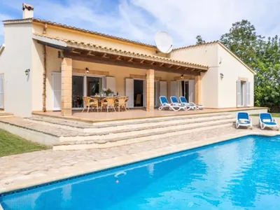 A family villa in Crestatx with a lovely heated pool and garden surrounded by trees. Casa de Suenos is down a private gated drive in a peaceful part of Crestatx, an up-market residential area just a few minutes drive from Pollenca. The villa has 3 double bedrooms all en-suite and with built in wardrobes. The villa is all on one level which is especially good for children. The property has a fully enclosed gated garden with grassed areas for children to play, and also benefits from a south facing pool and terrace but also areas of shade.Lovely covered terrace, fabulous for alfresco dining, and near the purpose built bar be que.